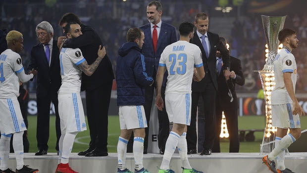Ο Θόδωρος Θεοδωρίδης αγκάλιασε τον Κώστα Μήτρογλου στην απονομή, μετά τον χαμένο για τη Μαρσέιγ τελικό του Europa League από την Ατλέτικο Μαδρίτης. (PHOTO)