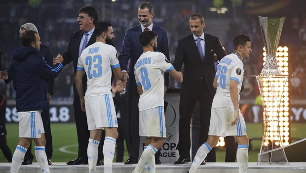 Marseille players pass the trophy after being greeted by Spain's King Felipe, center, having lost the Europa League Final soccer match between Marseille and Atletico Madrid at the Stade de Lyon in Decines, outside Lyon, France, Wednesday, May 16, 2018. (AP Photo/Francois Mori)