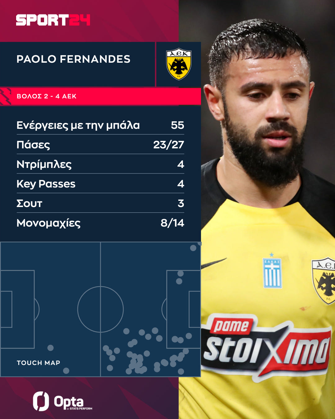 Από τα δεξιά προσπαθούσε να δημιουργήσει διαρκώς κινδύνους με κάθε τρόπο. Είχε 4 key passes, όντας ο καλύτερος δημιουργός της ΑΕΚ στο ματς, αλλά και τέσσερις πετυχημένες ντρίμπλες (4/4) επί του προσωπικού του αντιπάλου, Φράνκο Φεράρι, ο οποίος έκανε ζημιά στην άμυνα της ΑΕΚ.