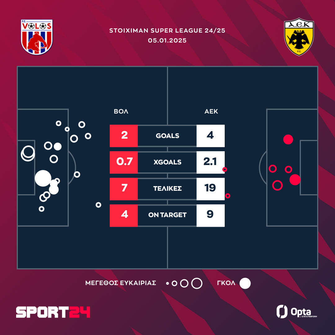 Η ΑΕΚ έκανε ποδαρικό με νίκη στο 2025, καθώς επικράτησε 4-2 του Βόλου στο Πανθεσσαλικό, ενώ χάρη σε αυτό το τρίποντο ανέβηκε τρίτη, μιας και ο ΠΑΟΚ έχασε από τον Παναθηναϊκό στο ΟΑΚΑ, ενώ περιμένει να δει το αποτέλεσμα του Ολυμπιακού στο Αγρίνιο.