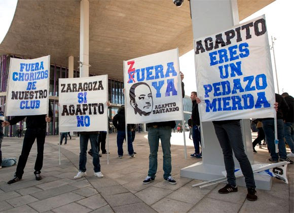 Ο μεγαλομέτοχος της Σαραγόσα (που αγωνίζεται στη Σεγούντα), Αγαπίτο Ιγκλέσιας, κατέθεσε την προηγούμενη εβδομάδα στον ανακριτή για μια υπόθεση υπεξαίρεσης 50 εκατομμυρίων ευρώ στην οποία είναι κατηγορούμενος. Οι φίλαθλοι της Σαραγόσα προσπαθούν εδώ και καιρό να τον ξεφορτωθούν και αυτή τη φορά συγκεντρώθηκαν έξω από τα δικαστήρια της πόλης για να εκφράσουν τα “συναισθήματά” τους απέναντι στον παράγοντα. Τα πλακάτ που κρατούσαν, έγραφαν διάφορα. ‘”Εξω οι κλέφτες από τον σύλλογό μας”, “Έξω τώρα Αγαπίτο μπάσταρδε” και το κορυφαίο “Αγαπίτο είσαι ένας μεγάλος κουράδας”!!!!!