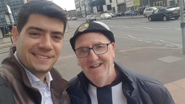 Την ώρα που θελήσαμε να βγάλουμε φωτογραφία έξω από το κτίριο όπου στεγάζεται το BBC στο Νότιγχαμ, του προκάλεσε περιέργεια η κίνησή μας. Ανάλογη περιέργεια και η δική μας, όταν είδαμε το παρουσιαστικό του, αλλά και το μελαγχολικό του πρόσωπο. Αφού του εξηγήσαμε τον λόγο της επίσκεψής μας στην πόλη, το αφιέρωμα στη Νότιγχαμ Φόρεστ των Ελλήνων ιδιοκτητών, μας εξήγησε ότι το μόνο που του είχε απομείνει να του δίνει χαρά, είναι να παρακολουθεί την αγαπημένη του Νοτς Κάουντι στο γήπεδο. Τον σύλλογο που παρακολουθούσε ανελλιπώς για περισσότερα από 50 χρόνια. Η “πτώση” τον πλήγωσε βαθύτατα, αφού όπως μας είπε αφιέρωσε τη ζωή του ολόκληρη να παρακολουθεί την ομάδα, η οποία παρεμπιπτόντως αποτέλεσε πηγή έμπνευσης για τη Γιουβέντους να αποκτήσει τα ίδια χρήματα το 1903.