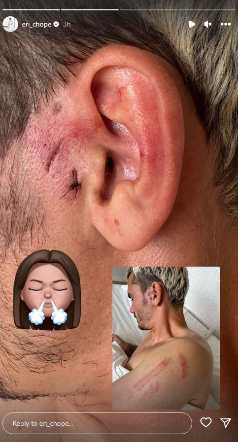 Η σύζυγος του Γκριεζμάν, Ερίκα Τσοπέρενα, ανέβασε δύο stories στον λογαριασμό της στο Instagram. Ένα τον σύντροφό της με τα… απομεινάρια της κλωτσιάς και ένα με τις σκέψεις της.