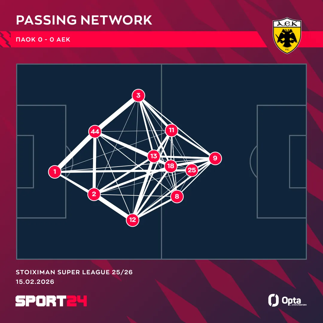 Ο Λούκα Γιόβιτς (9) ήταν ο πιο προωθημένος ποδοσφαιριστής της ΑΕΚ στο χορτάρι της Τούμπας, όπως φαίνεται στο γράφημα της Opta Stats / Perform. Ο Βάργκα (25) ήταν πιο πίσω του και μια τριάδα των εξτρέμ, Γκατσίνοβιτς (8), Κοϊτά (11) και Μαρίν (18) πίσω από τον Ούγγρο επιθετικό, ενώ για ένα ακόμα παιχνίδι η Ένωση βασίστηκε στον άξονά της τον οποίο υπερφόρτωσε.