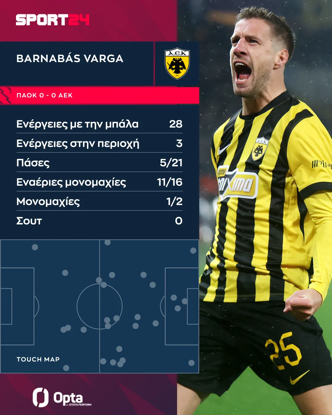 Εκεί που ξεχώρισε ο Ούγγρος επιθετικός ήταν στις μάχες που έδωσε στον αέρα με τους αμυντικούς του ΠΑΟΚ, καθώς κέρδισε τις 11 από τις 16 μονομαχίες, βοηθώντας την ΑΕΚ να μπορεί να κρατήσει την μπάλα ψηλά για να επιτεθεί στην κορυφή της επίθεσης, ενώ οι επίγειες μονομαχίες του ήταν πολύ λιγότερες, μόλις δύο και στη μια εξ αυτών βγήκε κερδισμένος.