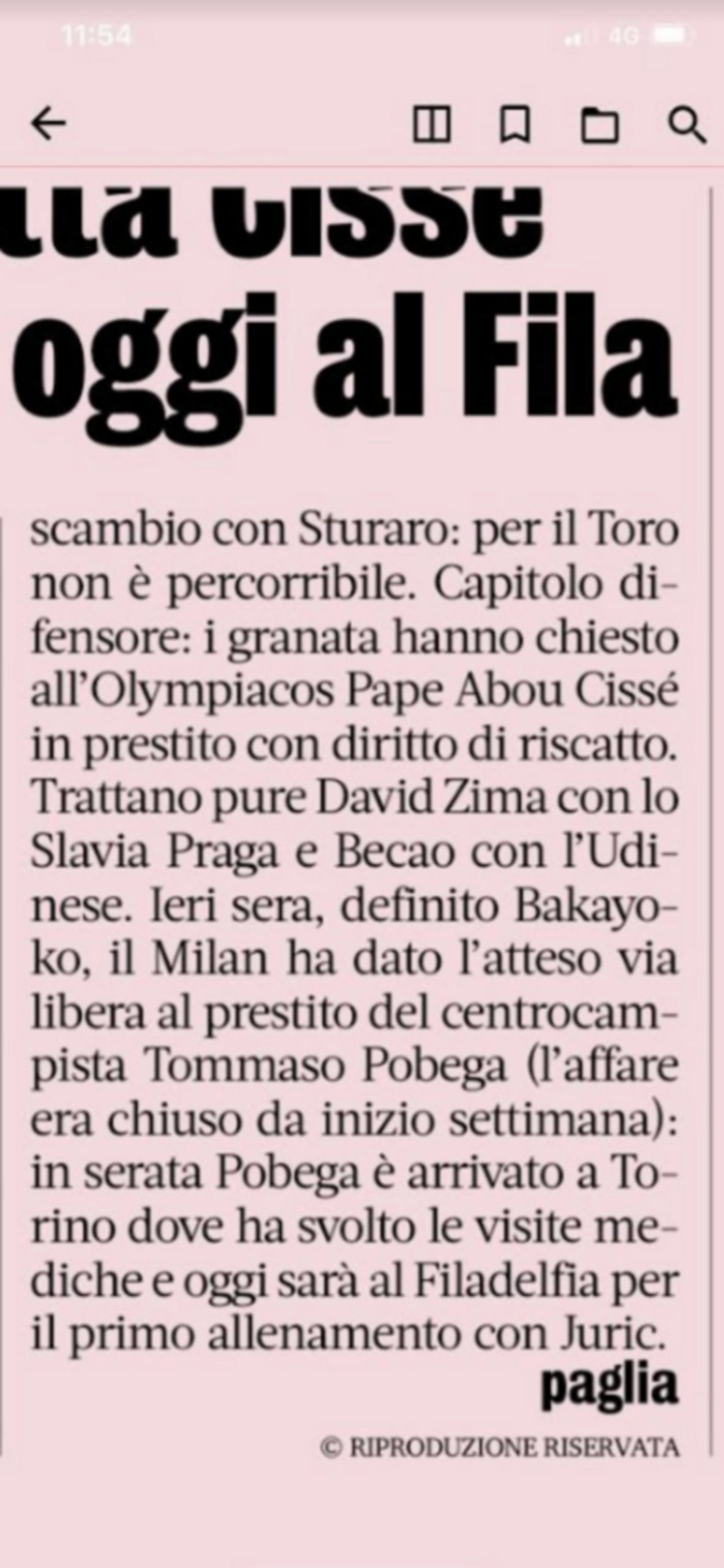 Σύμφωνα με ρεπορτάζ της “Gazzetta dello Sport”, ο Παπέ Αμπού Σισέ είναι το τελευταίο όνομα που προστέθηκε στη λίστα της γκρανάτα για την ενίσχυσή της στο κέντρο της άμυνας, με την μεγαλύτερη σε κυκλοφορία αθλητική εφημερίδα της Ιταλίας να υποστηρίζει πως οι Τορινέζοι χτύπησαν την πόρτα των πρωταθλητών Ελλάδας ζητώντας ως δανεικό με οψιόν αγοράς τον Παπέ Αμπού Σισέ.