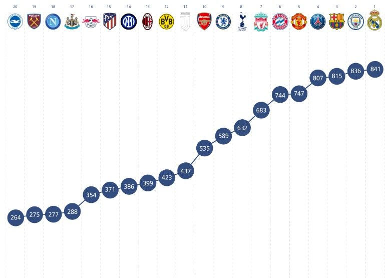 Η Ρεάλ αναδείχθηκε πρωταθλήτρια εσόδων, με την UEFA να υπολογίζει ότι εισέπραξε 841.000.000 για το 2022-2023. Ακολούθησε η Μάντσεστερ Σίτι με 836.000.000 και στην 3η θέση βρέθηκε η Μπαρτσελόνα με 815.000.000. Η Παρί ήταν η τελευταία ομάδα που έσπασε το φράγμα των 800.000.000 κατά 7.000.000.
