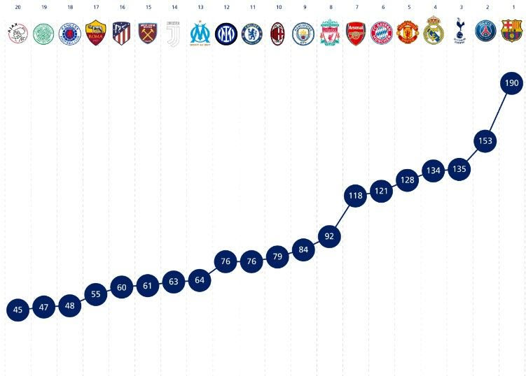 Οι ευρωπαϊκοί σύλλογοι με τα μεγαλύτερα έσοδα από εισιτήρια (σε εκατοντάδες εκατομμύρια ευρώ) UEFA