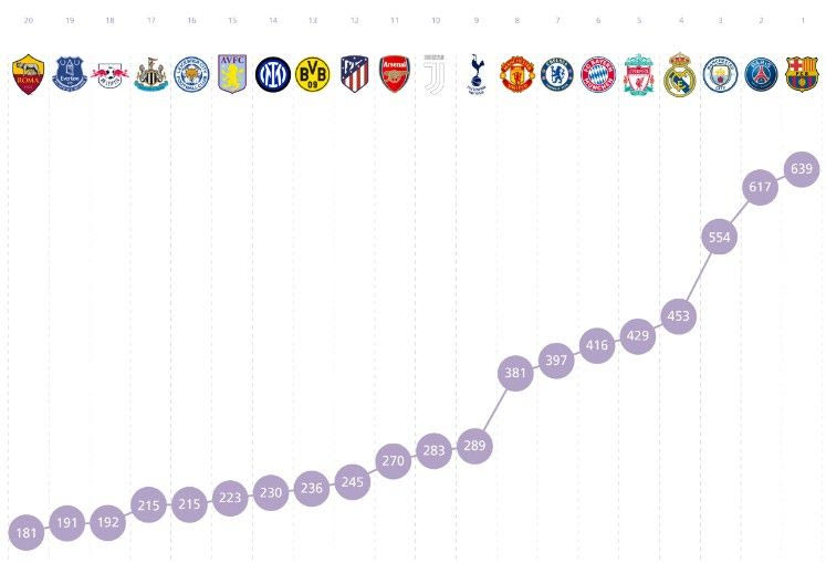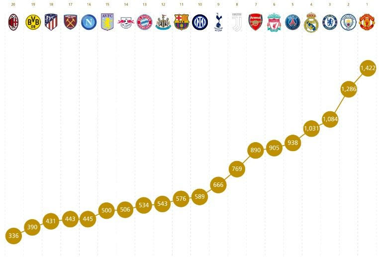 Οι ευρωπαϊκοί σύλλογοι με τα μεγαλύτερα έσοδα (σε εκατοντάδες εκατομμύρια ευρώ) UEFA