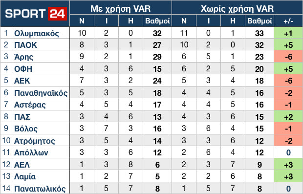Το SPORT24 μέτρησε όλες τις αποφάσεις, έκανε τους υπολογισμούς και σας παρουσιάζει τη βαθμολογία της Super League χωρίς τη χρήση του VAR. Αλλά πριν από αυτό, μερικές απαραίτητες εξηγήσεις.