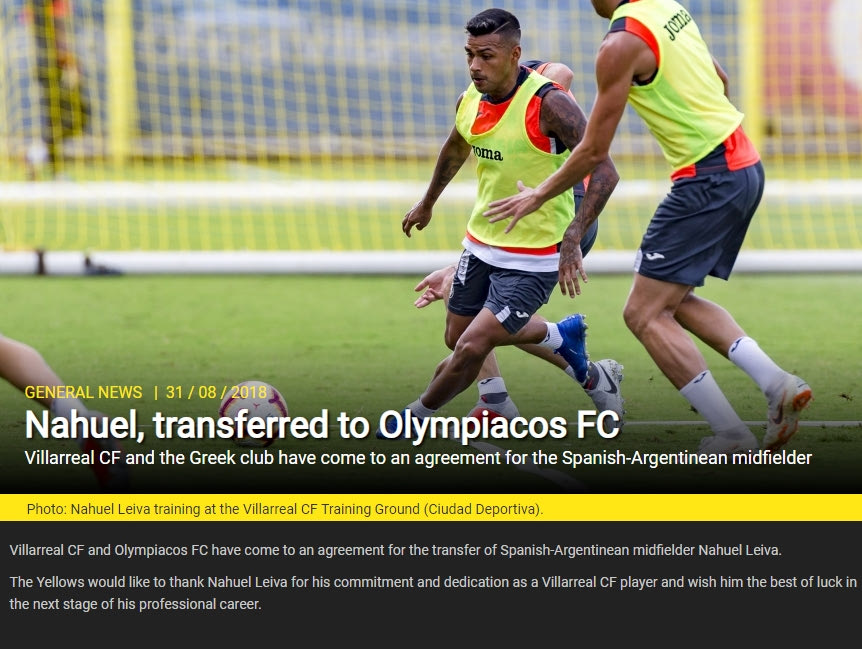 “Η Βιγιαρεάλ και Ολυμπιακός έφτασαν σε συμφωνία για τη μεταγραφή του Ισπανοαργεντινού μέσου, Ναουέλ Λέιβα. Η Βιγιαρεάλ θα ήθελε να ευχαριστήσει τον Ναουέλ Λέιβα για την αφοσίωση και την προσήλωσή του ως παίκτης της ομάδας και του εύχεται τα καλύτερα για το επόμενο βήμα της επαγγελματικής καριέρας του”, αναφέρει η ανακοίνωση του “κίτρινου υποβρυχίου”.