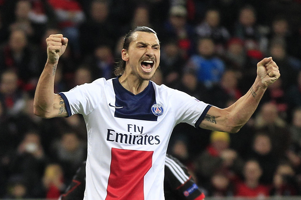 Ο Ζλάταν Ιμπραχίμοβιτς πανηγυρίζει αφού σκόραρε στο Λεβερκούζερν - Παρί Σεν Ζερμέν στο Champions League