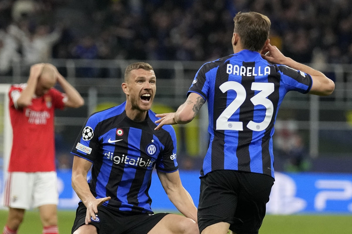 Ο Νικολό Μπαρέλα της Ίντερ πανηγυρίζει με τον Έντιν Τζέκο γκολ που σημείωσε κόντρα στην Μπενφίκα για τα προημιτελικά του Champions League 2022-2023 στο "Τζιουζέπε Μεάτσα", Μιλάνο | Τετάρτη του Πάσχα 19 Απριλίου 2023 © 2023/Antonio Calanni/AP IMAGES