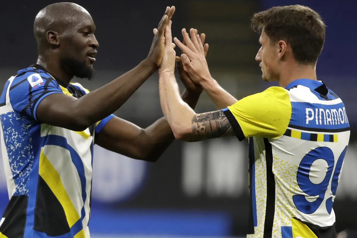 Inter Milan's Romelu Lukaku, left, celebrates his goal with his teammate Andrea Pinamonti during a Serie A soccer match between Inter Milan and Roma at the San Siro stadium in Milan, Italy, Wednesday, May 12, 2021. (AP Photo/Luca Bruno) @ 2021 Luca Bruno/Associated Press