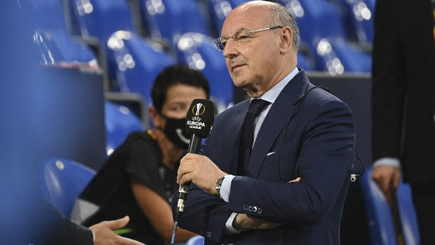 Giuseppe Marotta, CEO for sport at Inter speaks during an interview before the Europa League round of 16 soccer match between Inter Milan and Getafe at the Veltins-Arena in Gelsenkirchen, Germany, Wednesday, Aug. 5, 2020. (Ina Fassbender, Pool Photo via AP)