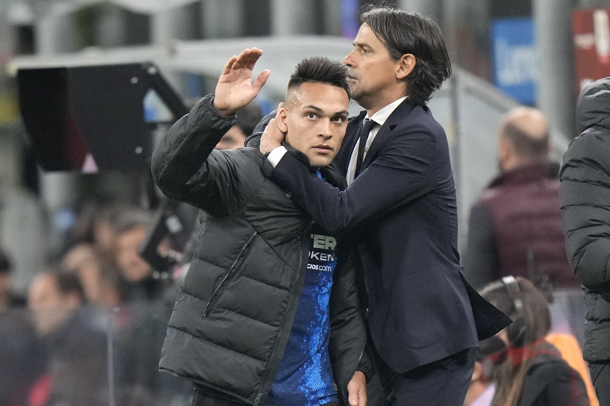 Ο Σιμόνε Ιντζάγκι αγκαλιάζει τον Λαουτάρο Μαρτίνες σε ματς της Ίντερ για το Κύπελλο Ιταλίας απέναντι στην Μίλαν | 19 Απριλίου 2022 @2023 Luca Bruno/AP IMAGES