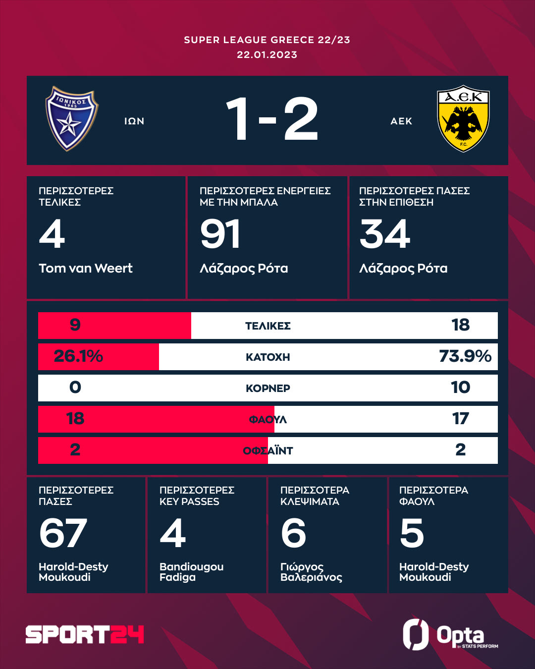 Η ΑΕΚ μόχθησε αλλά απέδρασε από τη Νίκαια. Ο Ιωνικός στάθηκε εξαιρετικά στο πρώτο μέρος και προηγήθηκε με τον Σεμπά στο 38ο λεπτό, όμως η Ένωση πέτυχε την ανατροπή. Αρχικά ο Βίντα ισοφάρισε στο 82' και ο Τσούμπερ στο 90+2' έκανε το 2-1.