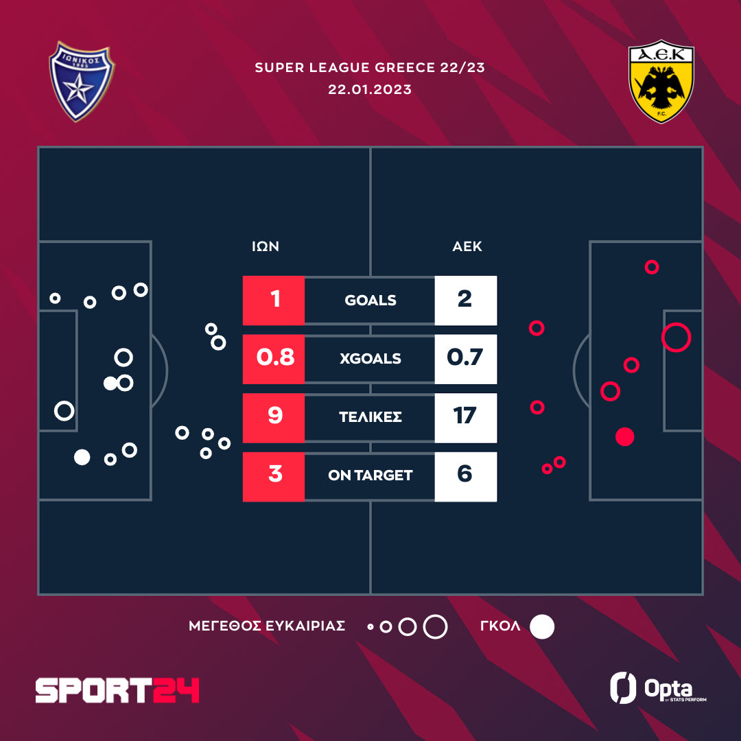 Ο Ιωνικός “σόκαρε” την ΑΕΚ για 45 λεπτά, ελέγχοντας το παιχνίδι. Μάλιστα κατάφερε να βρει το προβάδισμα στο σκορ με τον Σεμπά στο 38ο λεπτό, όμως στο δεύτερο μέρος η ΑΕΚ πίεσε και στο τέλος κατάφερε να φέρει τούμπα το ματς με τα γκολ του Βίντα στο 82′ και του Τσούμπερ στο 90+2′.