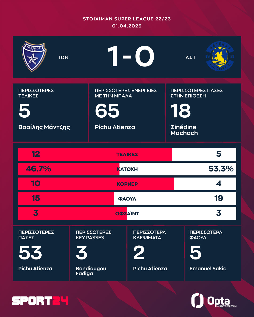 Ο Ιωνικός ήθελε περισσότερο το τρίποντο και επικράτησε 1-0 του Αστέρα Τρίπολης στη Νέαπολη και με τη νίκη αυτή προσπέρασε τον Λεβαδειακό στη μάχη των playouts και έμεινε "ζωντανός" στη μάχη της παραμονής.