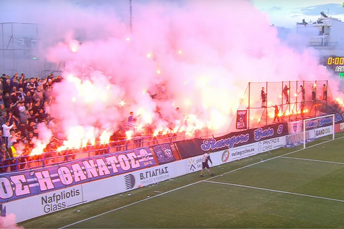 Ο κόσμος του Ιωνικού έδωσε ένα δυνατό παρών στη Νεάπολη και με συνθήματα και καπνογόνα δημιούργησε μία εντυπωσιακή ατμόσφαιρα πριν από τον τελικό παραμονής με τη Λαμία.