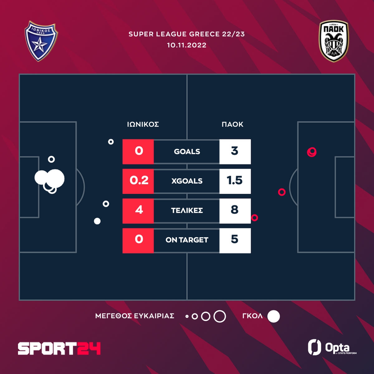 Το φινάλε του πρώτου μέρους βρήκε τον ΠΑΟΚ να ελέγχει το ματς και με μόλις πέντε τελικές (τρεις εντός εστίας) να έχει δύο γκολ, για να έρθει το δεύτερο μέρος και να κλείσει οριστικά την υπόθεση τρίποντο.