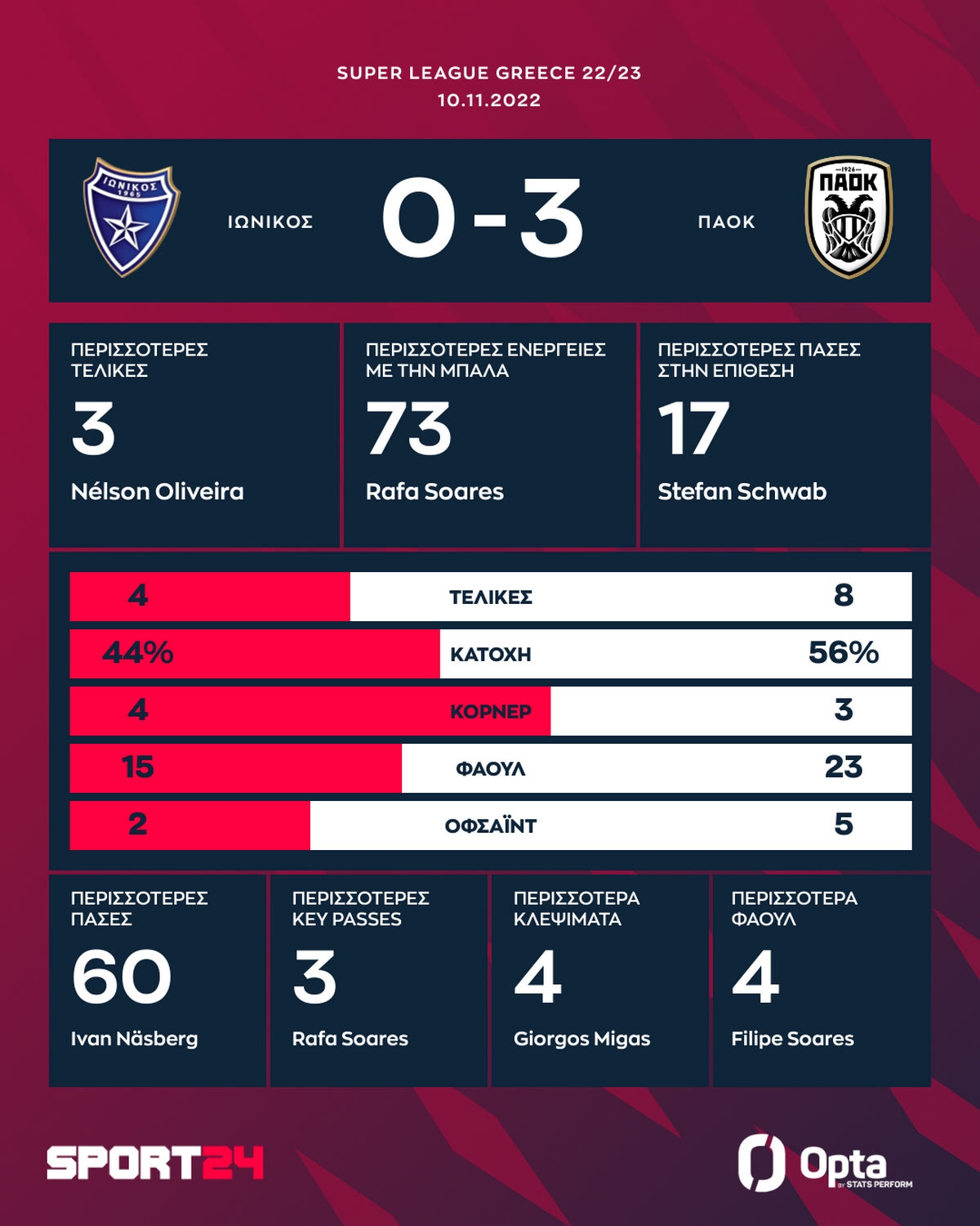 ΙΩΝΙΚΟΣ: Χουτεσιώτης, Σόουζα, Τσιγκρίνσκι, Μύγας, Σάκιτς, Ρομαό (69′ Κάνιας), Λοβέρα (69′ Μεντόσα), Φαντιγκά (83′ Μάσας), Σεμπά (84′ Τσίμπσαχ), Ελευθεριάδης (69′ Ιωαννίδης), Μάντζης
