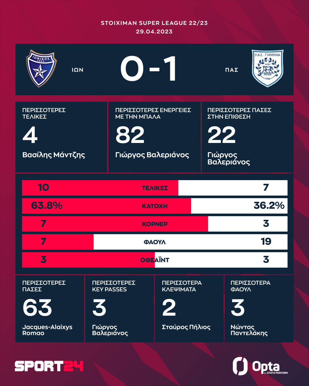 Ο Ιωνικός είχε στο μεγαλύτερο κομμάτι του αγώνα την πρωτοβουλία των κινήσεων, ωστόσο σε ελάχιστες φορές μπόρεσε να γίνει απειλητικός στα καρέ του ΠΑΣ. Η καλύτερη στιγμή των Νικαιωτών ήταν η σέντρα σουτ του Ρομαό στο 87′, η οποία σταμάτησε στο οριζόντιο δοκάρι. Το ματς σε γενικές γραμμές δεν είχε ρυθμό κάτι που βόλεψε τους Ηπειρώτες που πήραν αυτό που ήθελαν.