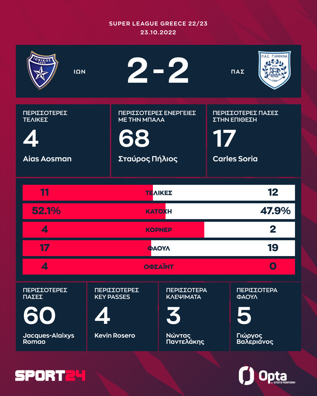 Ένα υπέροχο παιχνίδι έγινε στη Νεάπολη ανάμεσα στον Ιωνικό και τον ΠΑΣ Γιάννινα, με τις δύο ομάδες να αναδεικνύονται ισόπαλες 2-2 για την ένατη αγωνιστική της Super League.