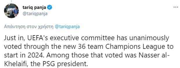 Το Champions League των 36 ομάδων είναι γεγονός και θα αρχίσει το 2024, όπως ψήφισε η Εκτελεστική Επιτροπή της UEFA, αψηφώντας τις εξελίξεις με τη European Super League. Υπέρ ψήφισε και ο Νασέρ αλ Κελαϊφί της Παρί.