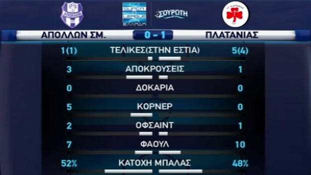 Προσπαθώντας να ξεπεράσει και τον κακό του εαυτό, ο Απόλλων βγήκε ορμητικός στο δεύτερο μέρος αλλά έπεσε πάνω στην… γκαντεμιά του! Στο 49′ ο Σιατραβάνης βρέθηκε στην περιοχή του Πλατανιά, έκανε το σουτ, αλλά η μπάλα βρήκε το δεξί δοκάρι και κατέληξε άουτ.
