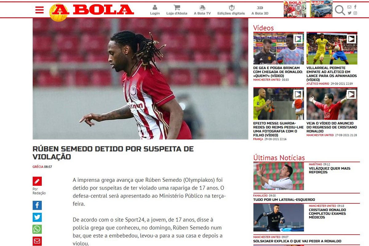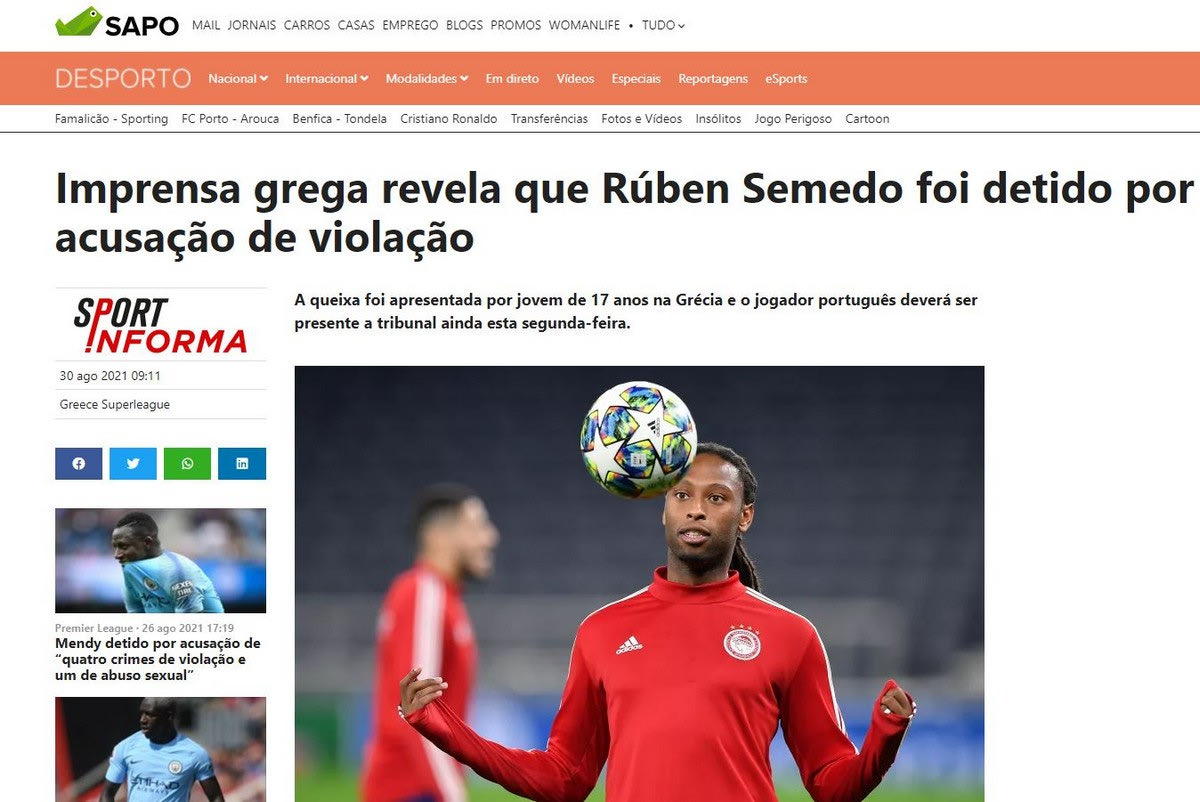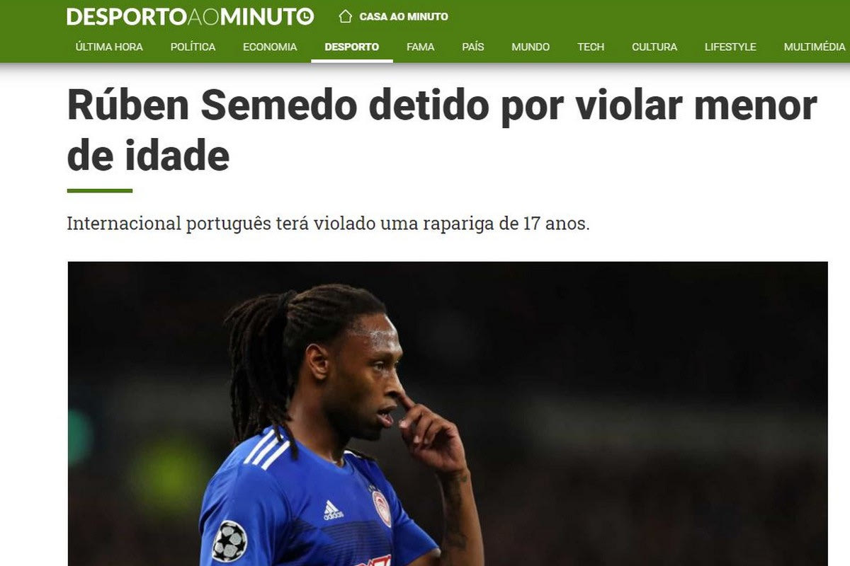 Συνελήφθη ο Πορτογάλος ποδοσφαιριστής του Ολυμπιακού, Ρούμπεν Σεμέδο, κατηγορούμενος για βιασμό, ύστερα από καταγγελία ανήλικης αρχικά στο Τμήμα Ασφαλείας Βύρωνα και στην συνέχεια στο Υποδιεύθυνση Προστασίας Ανηλίκων της Ασφάλειας Αττικής και έχει γίνει πρώτο θέμα στα πορτογαλικά ΜΜΕ.
