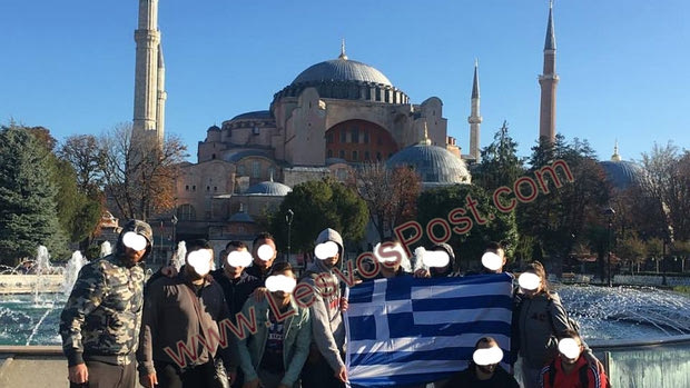 Φίλοι του Ολυμπιακού από τη Μυτιλήνη ταξίδεψαν μέσω Τουρκίας για τη Βαρκελώνη και βρέθηκαν έξω από την Αγιά Σοφιά όπου ύψωσαν την ελληνική σημαία. (PICS)