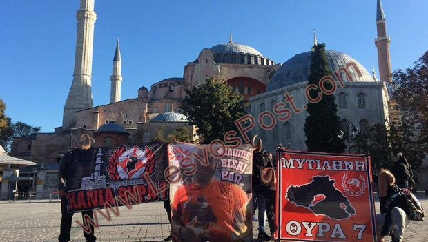 Φίλαθλοι του Ολυμπιακού που ταξίδεψαν από την Μυτιλήνη μέσω Τουρκιάς για την Βαρκελώνη με σκοπό να παρακολουθήσουν τον αγώνα της Τετάρτης ανάμεσα στην Μπαρτσελόνα και τον Ολυμπιακό έκαναν στάση στην Κωνσταντινούπολη και ύψωσαν την σημαία της Ελλάδας, του Ολυμπιακού και της Θ.7 Μυτιλήνης έξω από την Αγία Σοφιά.