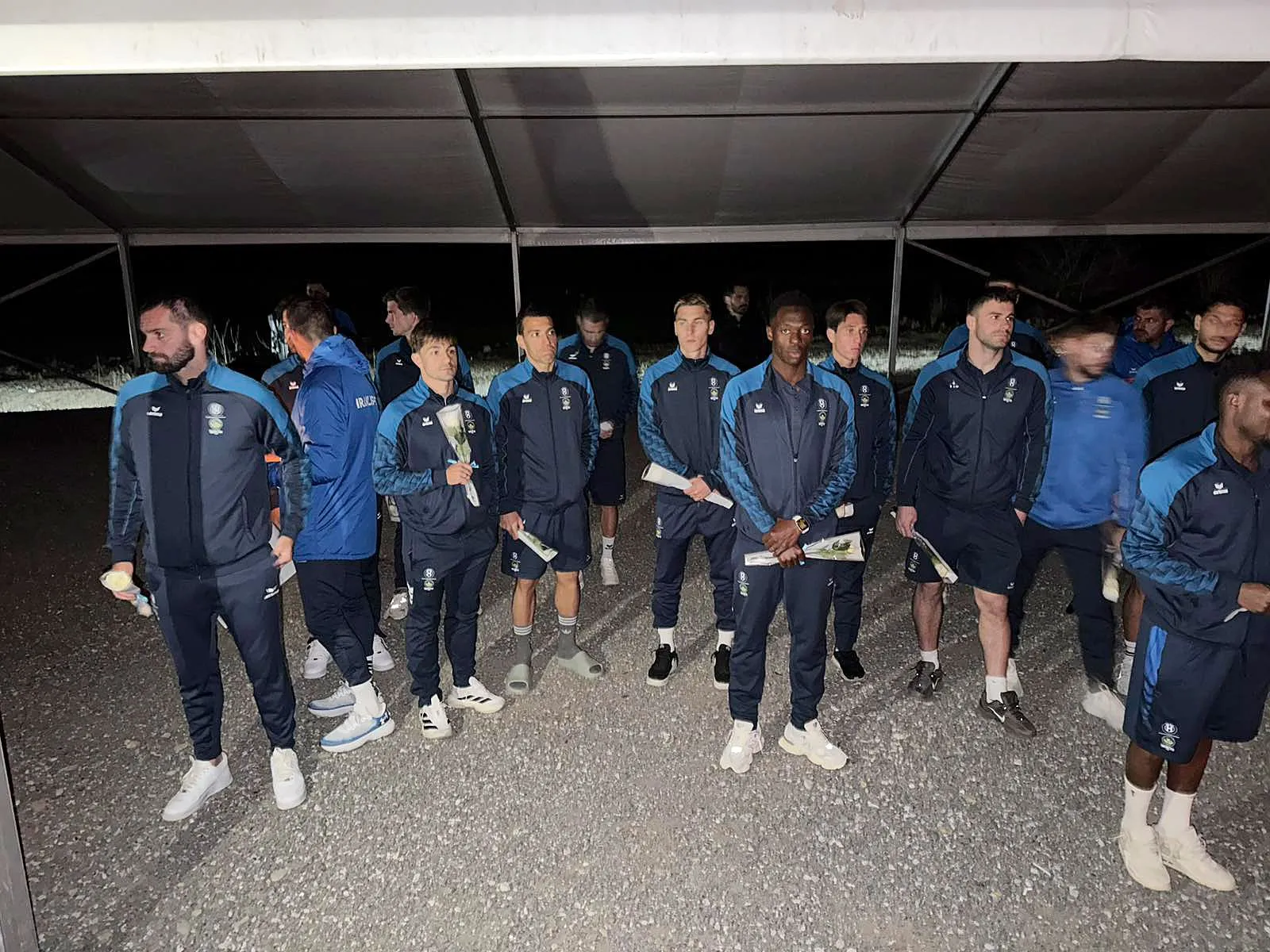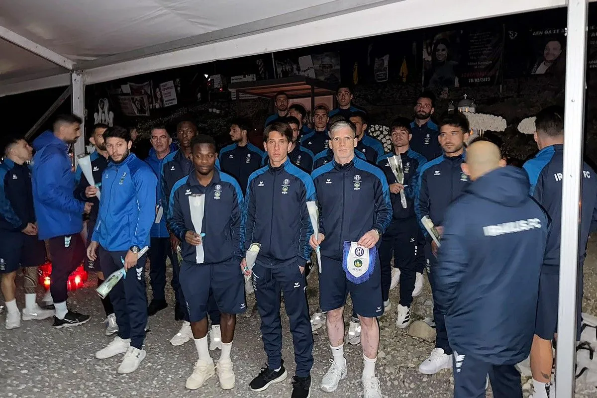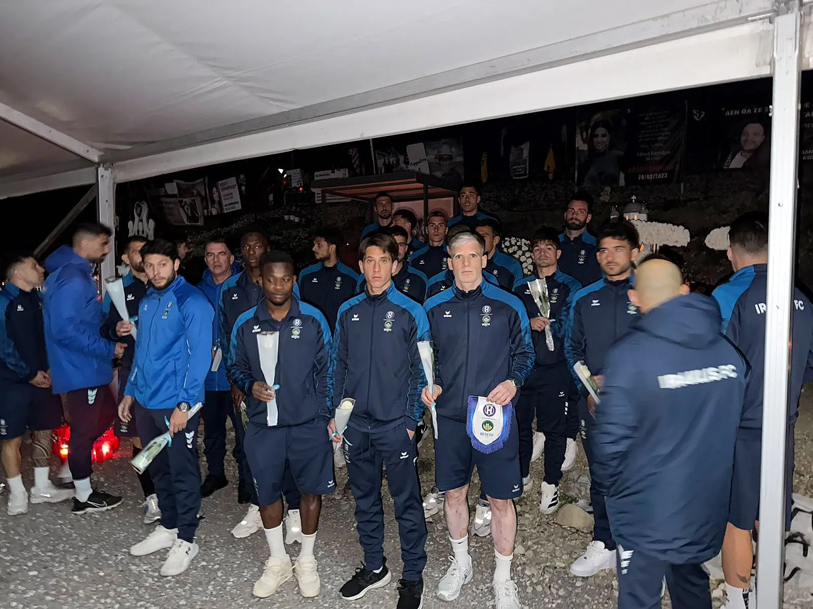 Κατά την επιστροφή της στη Θεσσαλονίκη, η αποστολή του Γηραιού έκανε στάση στα Τέμπη, στο σημείο του τραγικού δυστυχήματος της 28ης Φεβρουαρίου του 2023 και άφησε λουλούδια στη μνήμη των 57 θυμάτων.