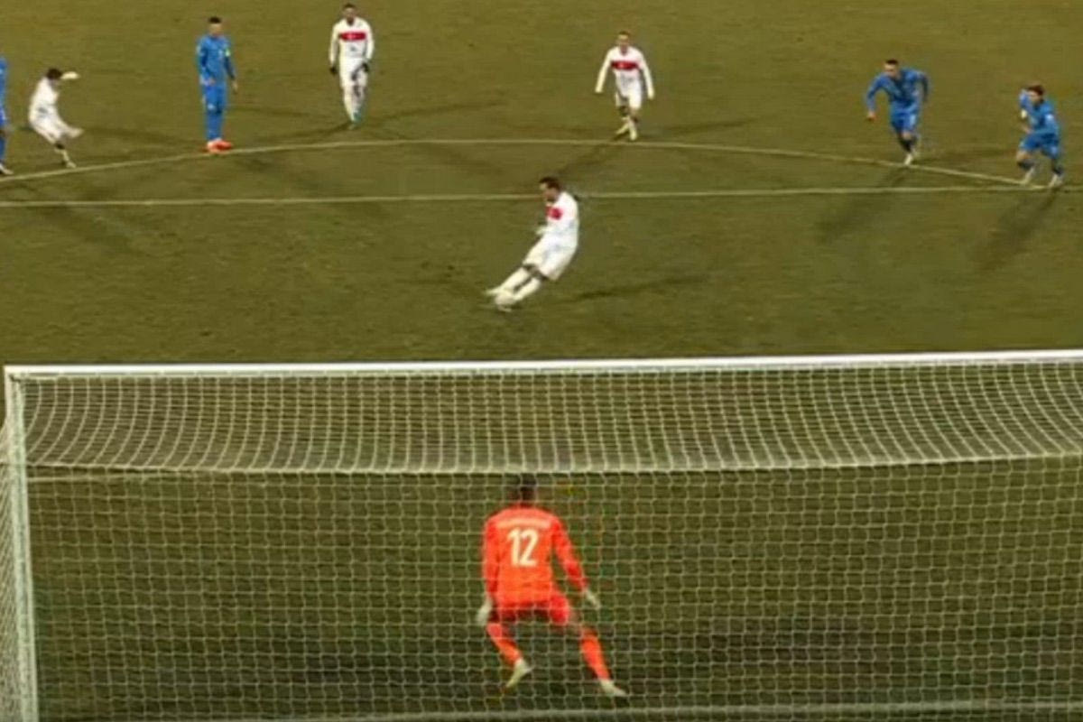 Ωστόσο κατά την εκτέλεσή του γλίστρησε (ο αγωνιστικός χώρος είναι σε κακή κατάσταση), με αποτέλεσμα να κάνει διπλή επαφή με την μπάλα κι έτσι η προσπάθειά του να θεωρείται άκυρη. Λίγα λεπτά μετά βέβαια οι Τούρκοι κέρδισαν νέο πέναλτι. Ο Τσαλχάνογλου το εκτέλεσε κι αυτό και ευστόχησε, κάνοντας το 2-1.