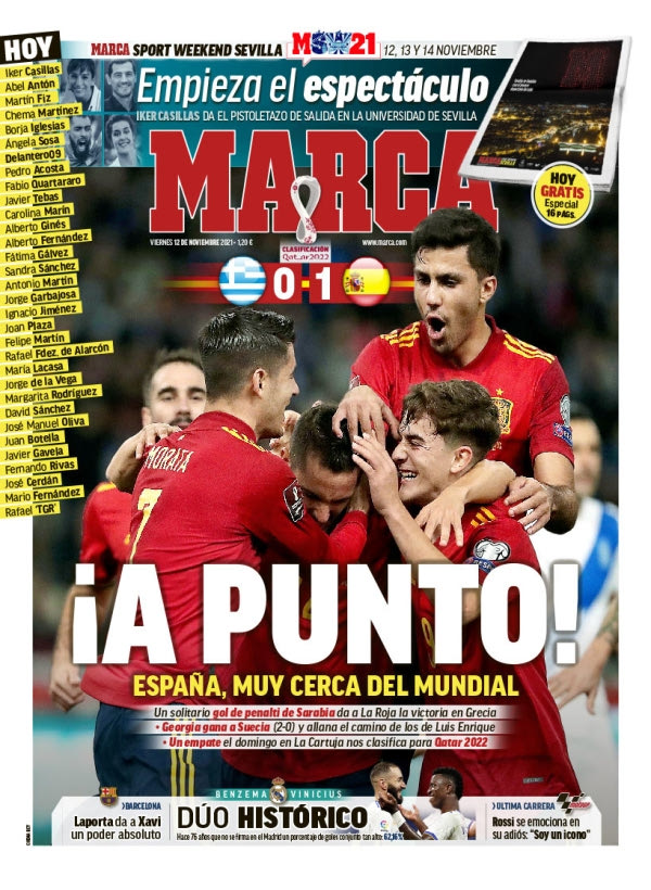 Μετά την νίκη κόντρα στην Ελλάδα και την ήττα της Σουηδίας από τη Γεωργία, οι Ισπανοί βρίσκονται στην κορυφή του δεύτερου ομίλου, με τον Τύπο της χώρας να έχει ξεκινήσει ήδη τους πανηγυρισμούς για την πρόκριση στο Μουντιάλ, γράφοντας πως η "ρόχα" είναι έτοιμη.