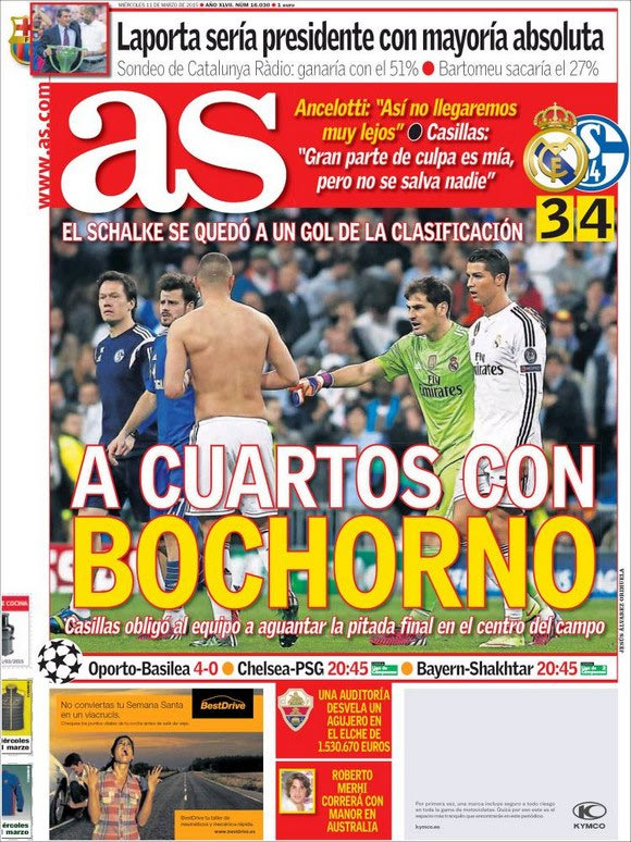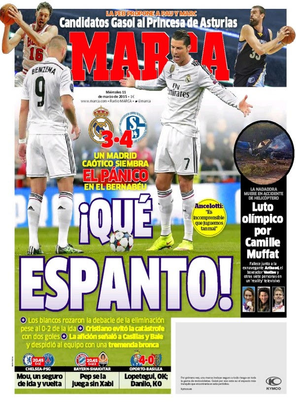Η ‘As’ σημειώνει ότι η Σάλκε έφτασε ένα γκολ από την πρόκριση τονίζοντας την τεσσάρα της αμηχανίας. Αποσβωλομένος ο Κριστιάνο Ρονάλντο μετά τη λήξη του αγώνα.