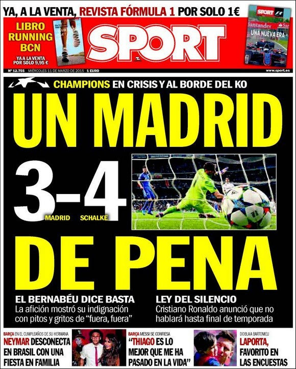 Η καταλανική ‘Sport’ δεν έχασε την ευκαιρία και χτυπάει τη μαδριλένικη ομάδα η οποία είναι σε κρίση τονίζοντας στον τίτλο “Μία Ρεάλ για λύπηση”.