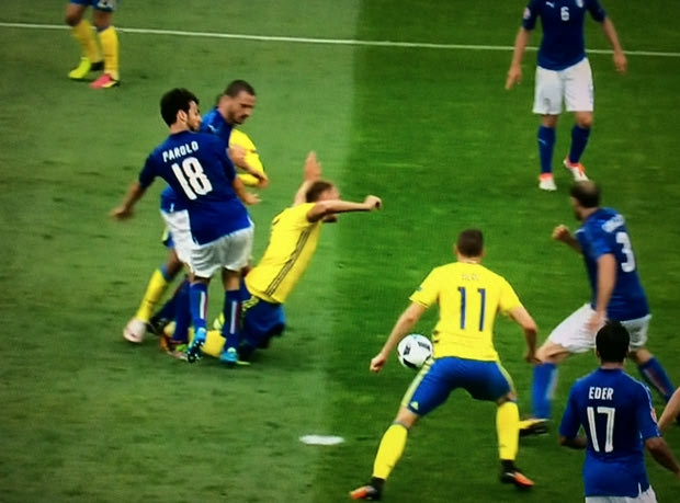 Η εθνική Ιταλίας νίκησε 1-0 αυτή της Σουηδίας, με τους παίκτες της δεύτερης να ζητούν πέναλτι στην τελευταία φάση του ματς. Σε αυτήν, ο Αντρέας Γκράνκβιστ πήγε να ξεφύγει από τον Μπονούτσι, αυτός τον συγκράτησε από τη φανέλα και τον έριξε, όμως ο Βίκτορ Κάσαϊ έδειξε να συνεχιστεί το ματς. Αυτή ήταν, ουσιαστικά, και η πρώτη αμφισβητούμενη φάση στην τελική φάση του Euro 2016.