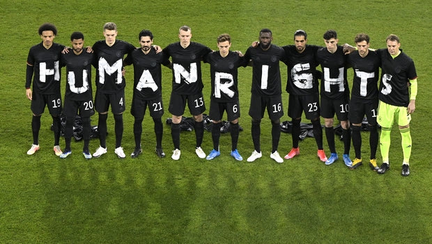 Συγκεκριμένα, οι Νόερ, Κλόστερμαν, Ρίντιγκερ, Τζαν, Γκίντερ, Γκιντογάν, Κίμιχ, Γκορέτσκα, Σανέ, Γκνάμπρι και Χάβερτς σχημάτισαν τη λέξη “human rights” (σ.σ. ανθρώπινα δικαιώματα), ως μήνυμα συμπαράστασης στους εργάτες που κατασκευάζουν τα γήπεδα στο Κατάρ.