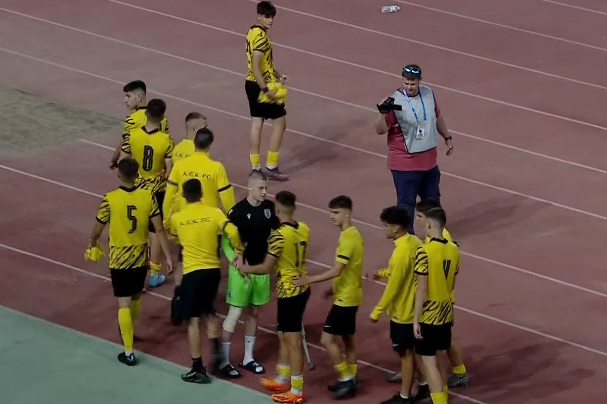 Όλοι οι παίκτες της ΑΕΚ Κ17 πήγαν όλοι μαζί και ευχήθηκαν περαστικά στον τερματοφύλακα του ΠΑΟΚ, Τσιντσόλη, ο οποίος αποχώρησε με πρόβλημα τραυματισμού και περίμενε με πατερίτσες εκτός αγωνιστικού χώρου.