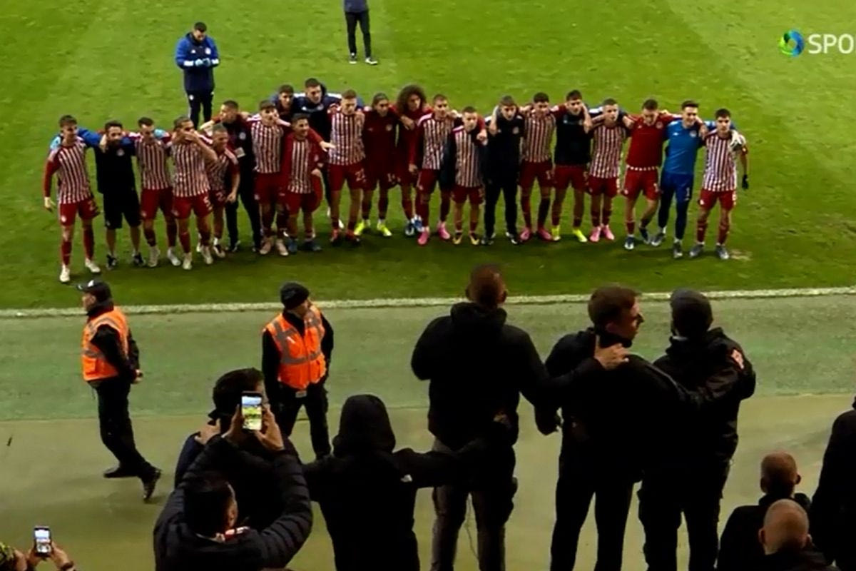 Μάλιστα, έγιναν όλοι μαζί μία μεγάλη αγκαλιά και πήγαν μπροστά από την εξέδρα που ήταν οι φίλοι του Ολυμπιακού για να τραγουδήσουν όλοι μαζί ένα από τα αγαπημένα συνθήματα της ερυθρόλευκης εξέδρας: το “Είσαι στο μυαλό κάτι μαγικό”.
