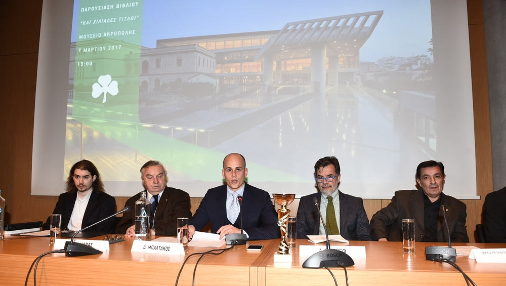 Η τεκμηρίωση της πλούσιας ιστορίας του Παναθηναϊκού Αθλητικού Ομίλου πραγματοποιήθηκε το βράδυ της Τρίτης (7/3) στο Μουσείο Ακροπόλεως. Η διοίκηση του Ερασιτέχνη και οι συγγραφείς Ανδρέας Οικονόμου, Αριστείδης Μπενόγλου, Παναγιώτης Αλαφάκης, Νίκος Πετρόπουλος, Γιώργος Κοκοής και Άγγελος Σκλαβουνάκης παρουσίασαν το βιβλίο “Και χιλιάδες τίτλοι”.