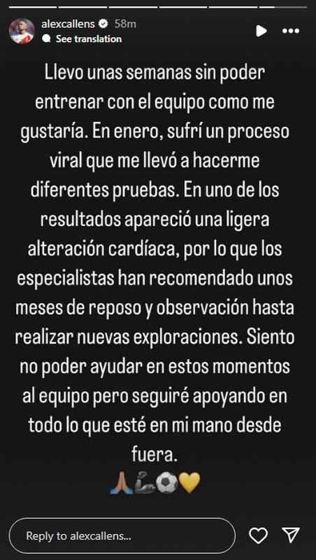 “Εδώ και μερικές εβδομάδες δεν μπορώ να προπονηθώ με την ομάδα όπως θα ήθελα. Τον Ιανουάριο, υπέστην μια ιογενή διεργασία που με οδήγησε να υποβληθώ σε διάφορες εξετάσεις.