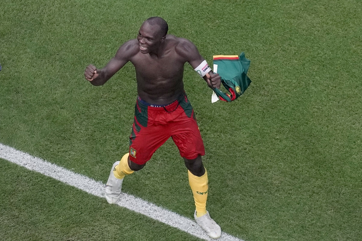 Cameroon's Vincent Aboubakar celebrates after scoring the opening goal during the World Cup group G soccer match between Cameroon and Brazil, at the Lusail Stadium in Lusail, Qatar, Friday, Dec. 2, 2022. (AP Photo/Thanassis Stavrakis)