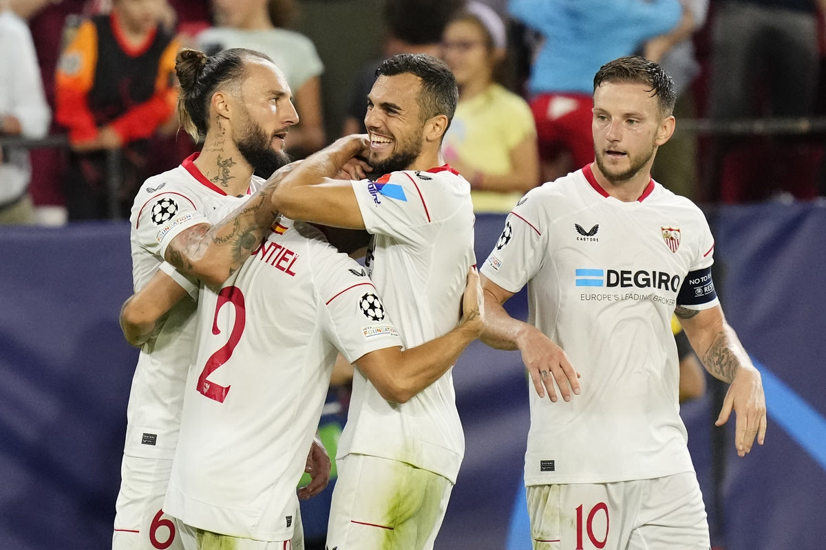 Οι παίκτες της Σεβίλλης πανηγυρίζουν γκολ που σημείωσαν κόντρα στην Κοπεγχάγη για τη φάση των ομίλων του Champions League 2022-2023 στο "Ραμόν Σάντσεθ Πιθχουάν", Σεβίλλη | Τρίτη 25 Οκτωβρίου 2022