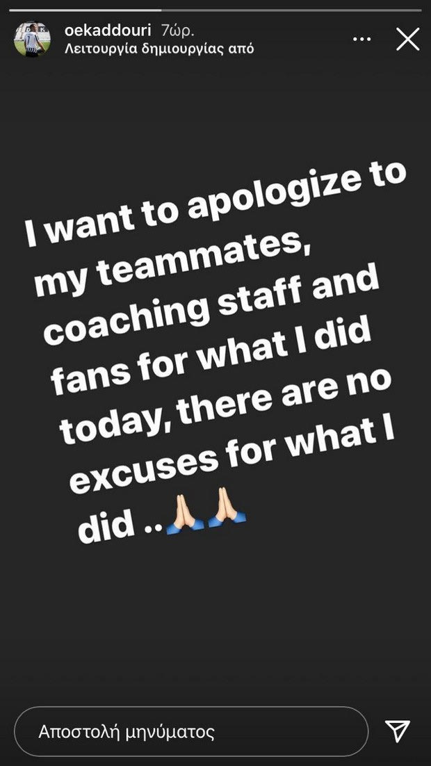 Ο Μαροκινός μέσω story στο Instagram απολογήθηκε στους συμπαίκτες του, το τεχνικό επιτελείο και τους οπαδούς του Δικεφάλου για την ενέργειά του και τόνισε ότι δεν υπάρχουν δικαιολογίες.