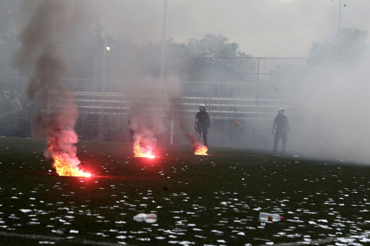 Ωστόσο, η ατμόσφαιρα δεν ήταν καθόλου καλή μετά το τέλος του αγώνα. Έπεσαν καπνογόνα στον αγωνιστικό χώρο, τα ΜΑΤ έκαναν την παρουσία τους, ενώ έγινε και χρήση χημικών.