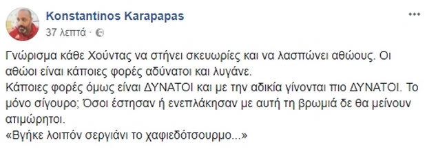 Ο Καραπαπάς έκανε ένα post στον λογαριασμό του στο facebook όπου έγραψε για “χούντα και σκευωρίες που λασπώνουν αθώους”, τονίζοντας: “κάποιες φορές οι δυνατοί με την αδικία γίνονται πιο δυνατοί”.