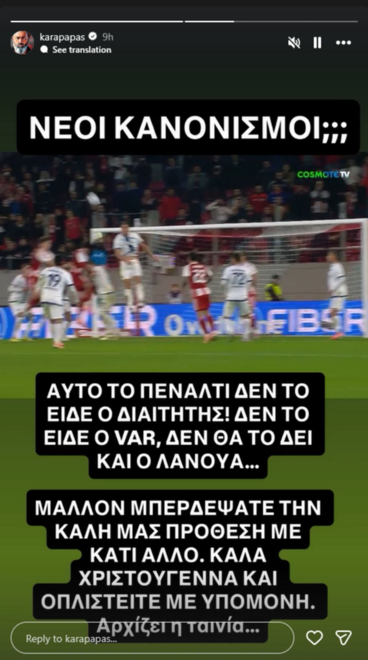 “Νέοι κανονισμοί;;; Αυτό το πέναλτι δεν το είδε ο διαιτητής! Δεν το είδε ο VAR, δεν θα το δει και ο Λανουά… Μάλλον μπερδέψατε την καλή μας πρόθεση με κάτι άλλο. Καλά Χριστούγεννα και οπλιστείτε με υπομονή. Αρχίζει η ταινία…”, ανέφερε χαρακτηριστικά.
